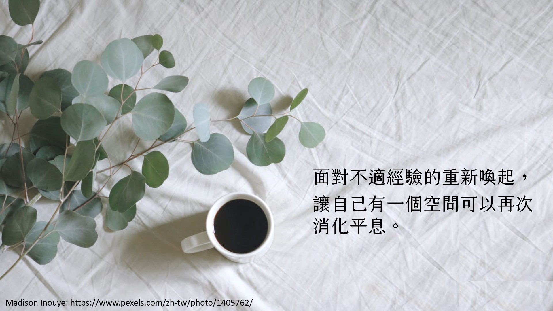 - 慢下來,給自己時間跟空間來處理發生的事情,記得每個人都會有自己的步調來處理創傷,包含你自己。