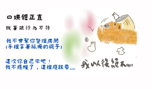 口嫌體正直:一邊說著反話,一邊順手或是配合。例如我不會幫你整理房間,同時手裡拿著掉落的衣服