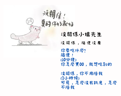 沒關係小姐先生:沒關係就是有關係,隨便就是不隨便。「例如你要吃什麼」,「隨便」,但又換來一陣抱怨、「你不陪我沒關係」,但之後有半天不接訊息。