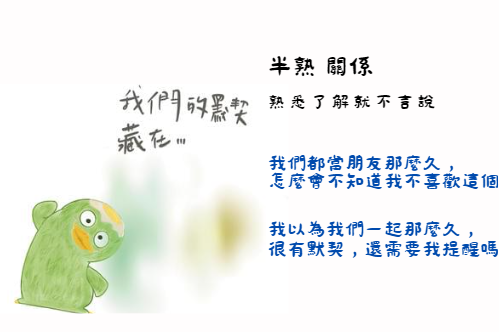 半熟 關係:因熟悉了解而不多說話,與以為對方知道不多說後面的含義。例如:「我們都這麼熟了,他怎麼會不知道我想什麼」、「我想我們不用再說什麼,我們很有默契了」、「之前00都知道我的習慣,為何這次⋯」