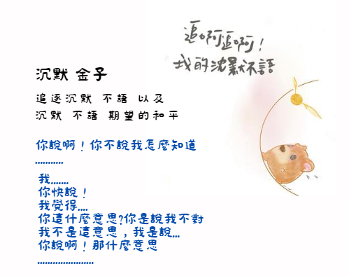 沈默 金子:在嘗試扮演「理解、涵容」之下的不說出口,以及追逐沈默的 金探子。例如「你說啊你不說我怎麼知道」,「⋯」,「我不知道要說什麼」
