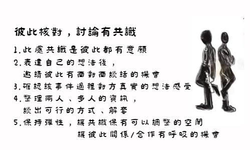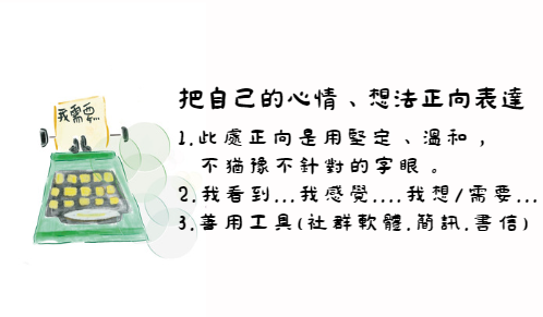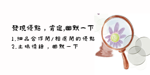 科技發達讓我們談關係可以「暫時」在鍵盤後,是的!只是暫時,因為文字的語氣是我們主觀解讀,所以,在確定彼此可以談一下的時刻(微微讀空氣),談出自己的感覺、想法後,確認對方的心情、想法與此時此刻,討論彼此都可以接受的方式,這裡說的是「們」的共識;此外保持共識的彈性,因著不同狀況適時有調整的空間。 - 發現優點與肯定,幽默一下: