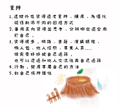 關係經營不容易,當感覺逃不出,關係舞步想舞出新舞步卻舞不出來,畢竟我們正在挑戰自小被薰陶的「以和為貴」文化觀,要處理與人除了「和樂」以外的情境,仰賴「勇氣」,評估自己的能與不能,有時確實需要連結外在給予的支持,網路正向搜尋資料、閱讀、與人談話,外掛一下他人的腦,擴充並讓正向支持協助我們整頓。