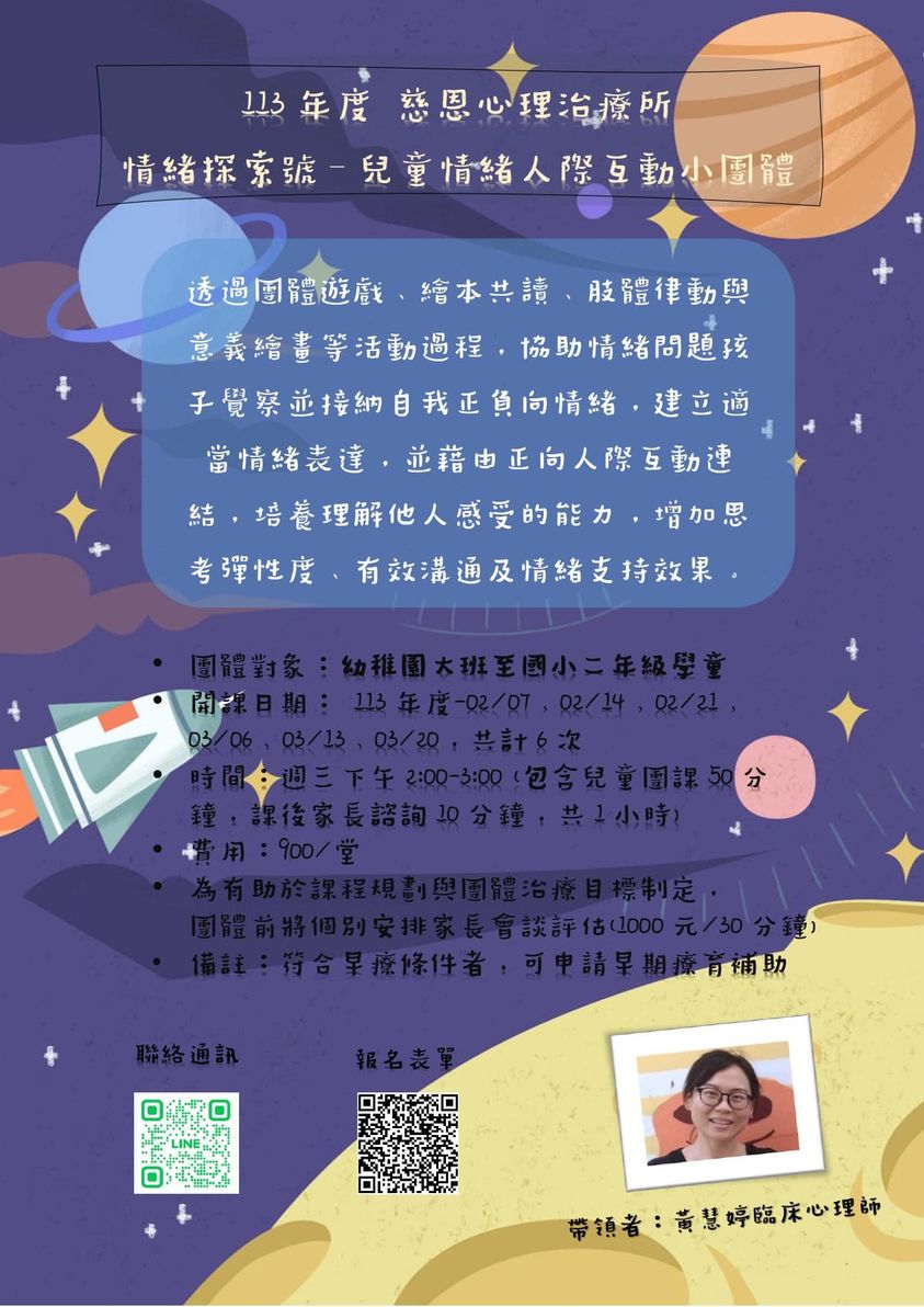 本團體由黃慧婷臨床心理師帶領,以兒童為主要互動對象,家長為輔助角色,透過團體遊戲、繪本共讀、肢體律動與意義繪畫等活動過程,協助情緒問題孩子覺察並接納自我正負向情緒,建立適當情緒表達,並藉由正向人際互動連結,培養理解他人感受的能力,增加思考彈性度、有效溝通及情緒支持效果。